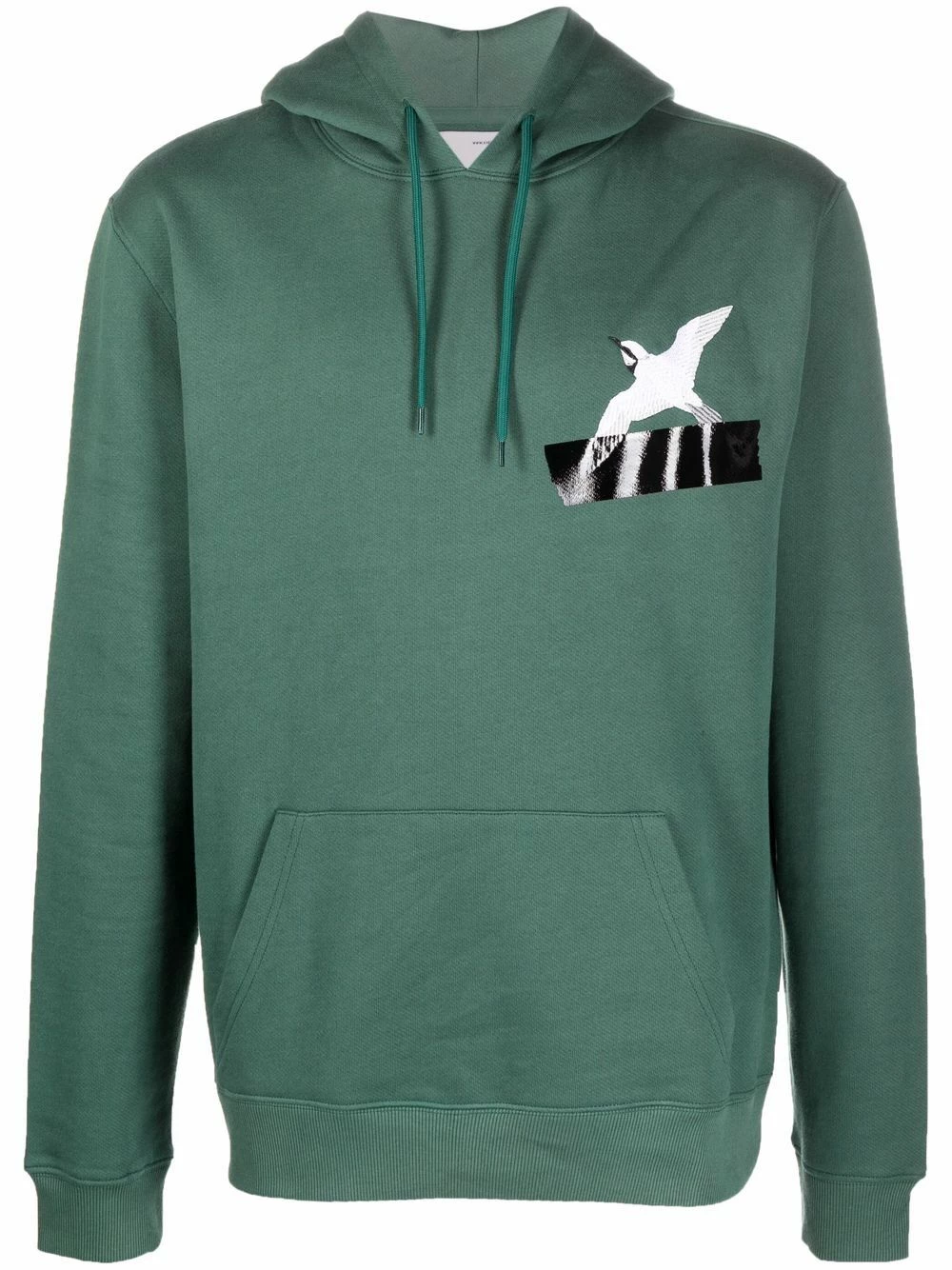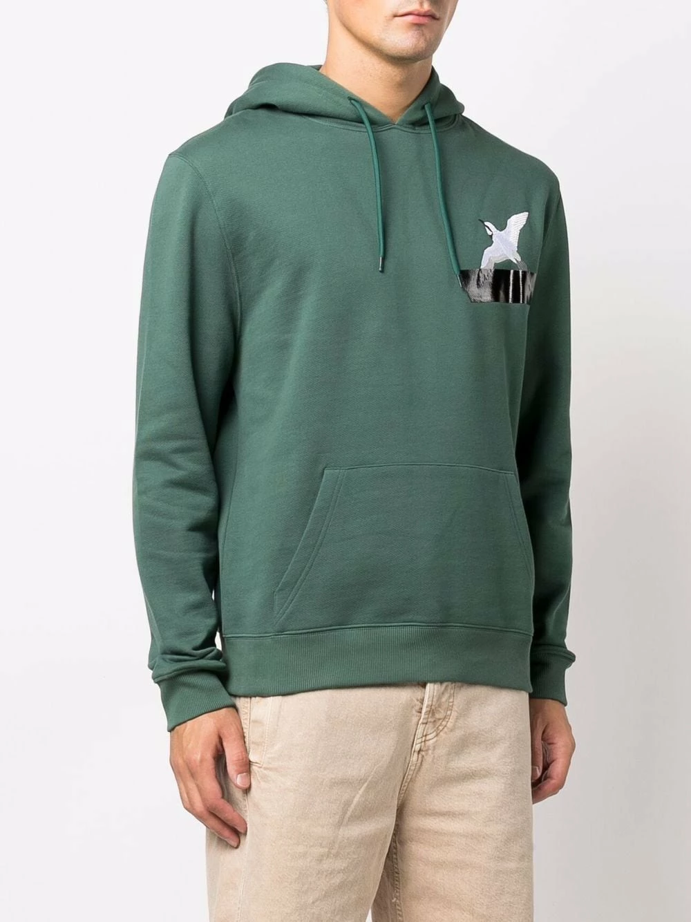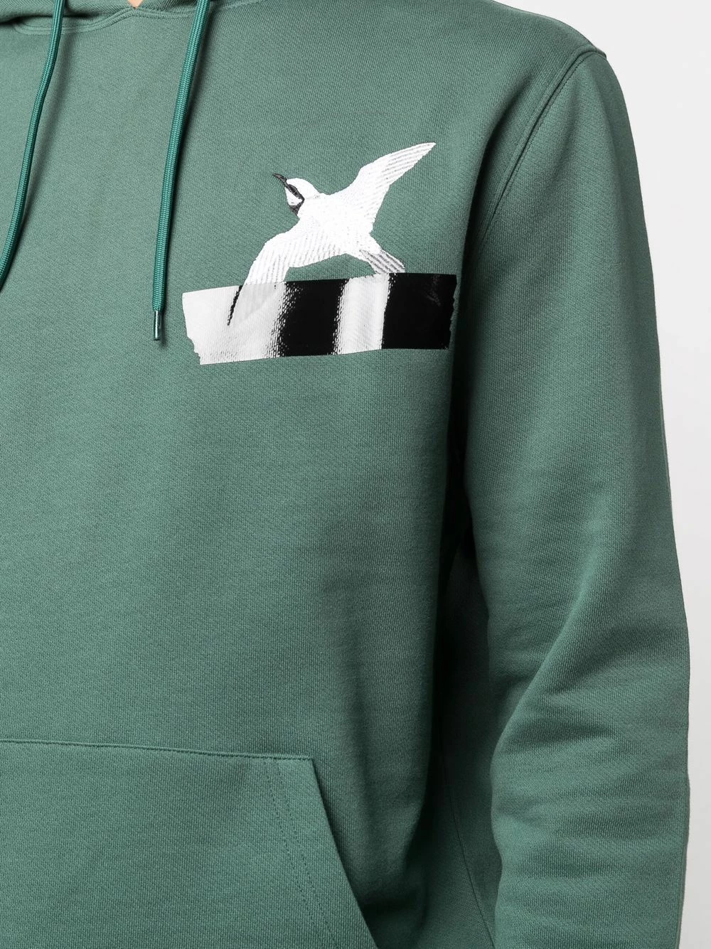 Détail nervuré, logo imprimé à la poitrine, capuche à lien de resserrage, manches longues, poche plaquée. Couleur : vert. Matière : coton biologique.