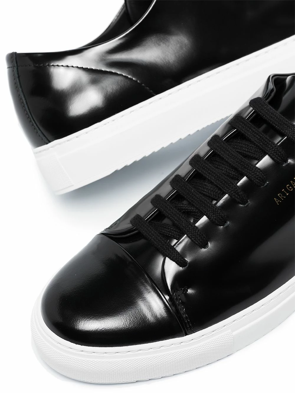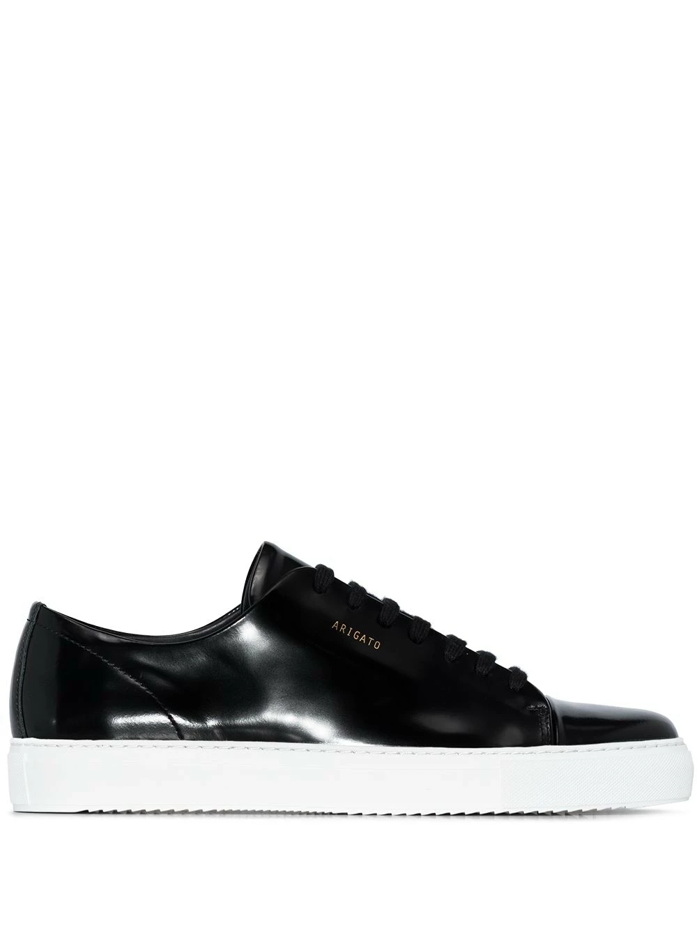 Baskets en cuir verni à bout rond en caoutchouc Axel Arigato avec semelle en caoutchouc, laçage sur le devant, bout en amande et logo embossé sur le côté. Couleur : noir.