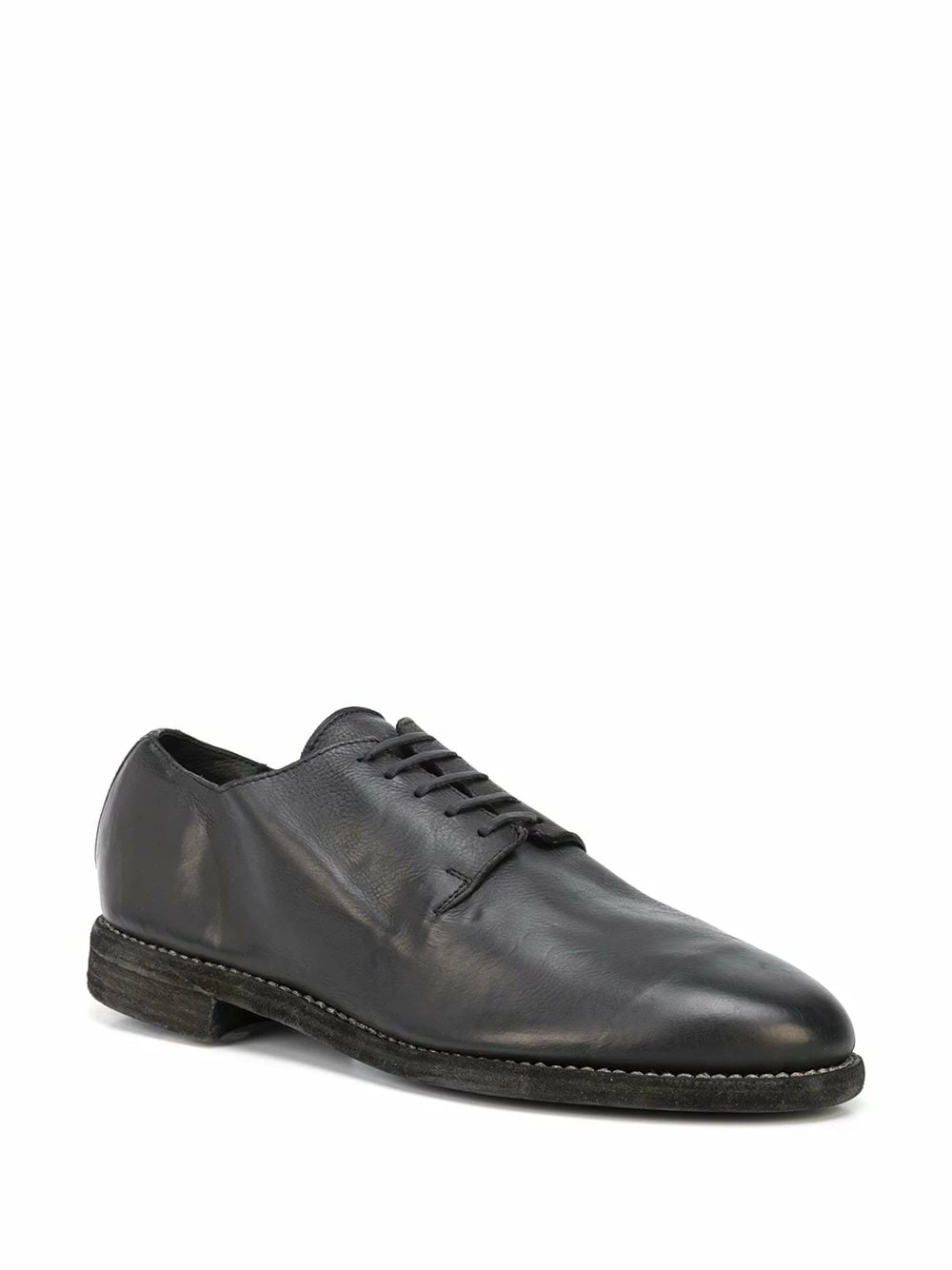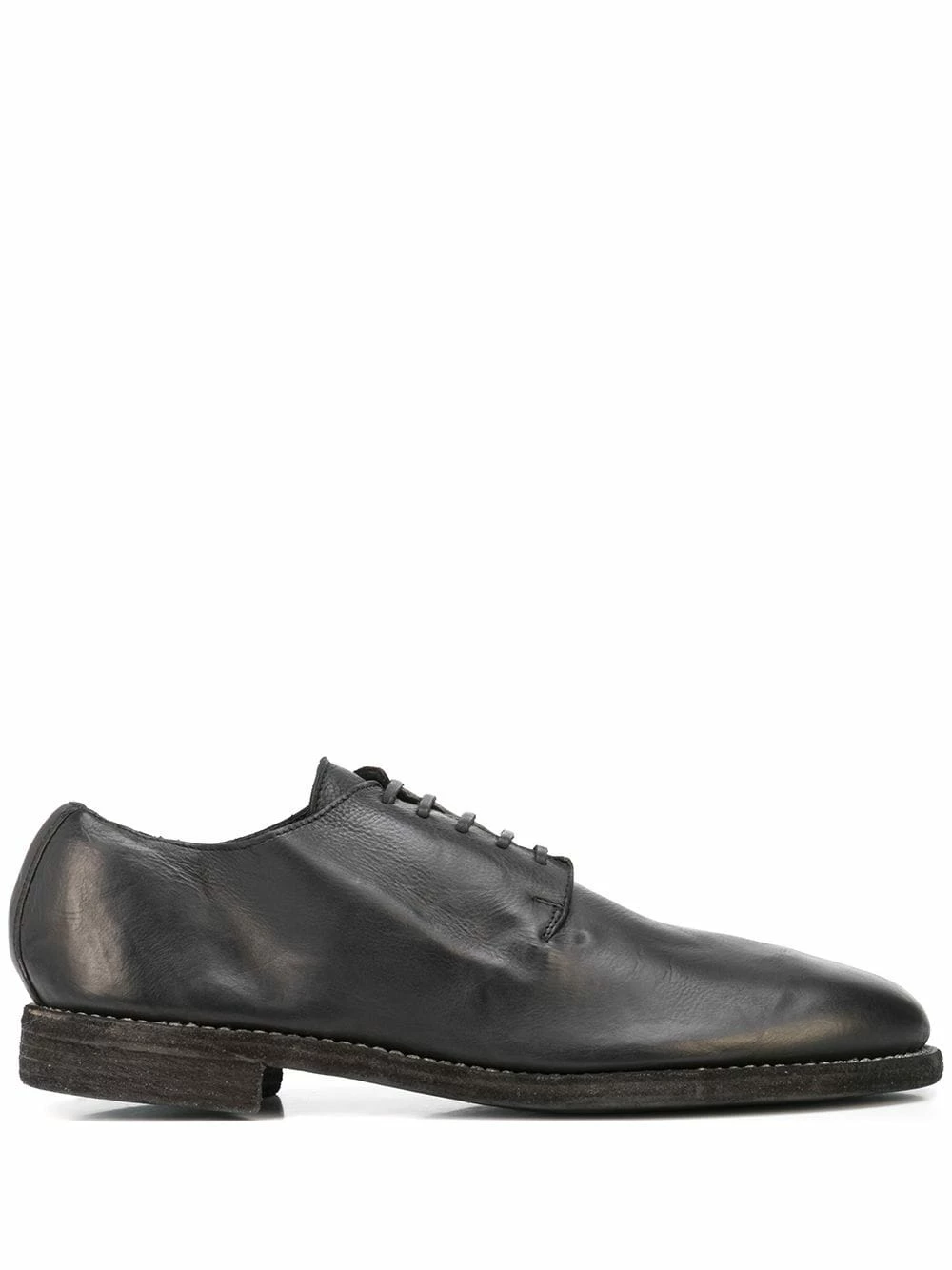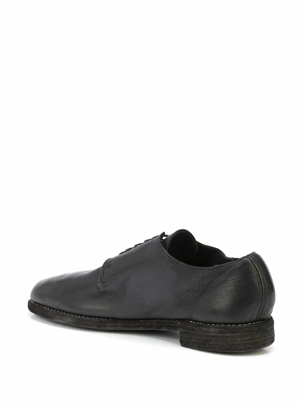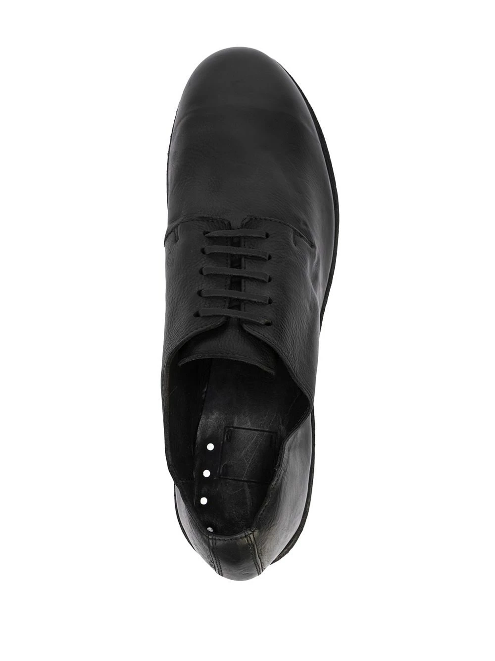 Bout rond, fermeture à lacer sur le devant, petit talon, semelle plate. Couleur : noir. Matière : cuir.