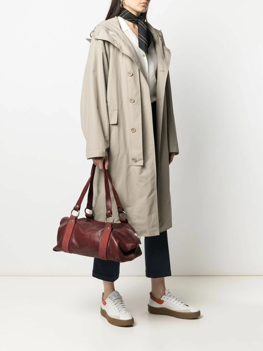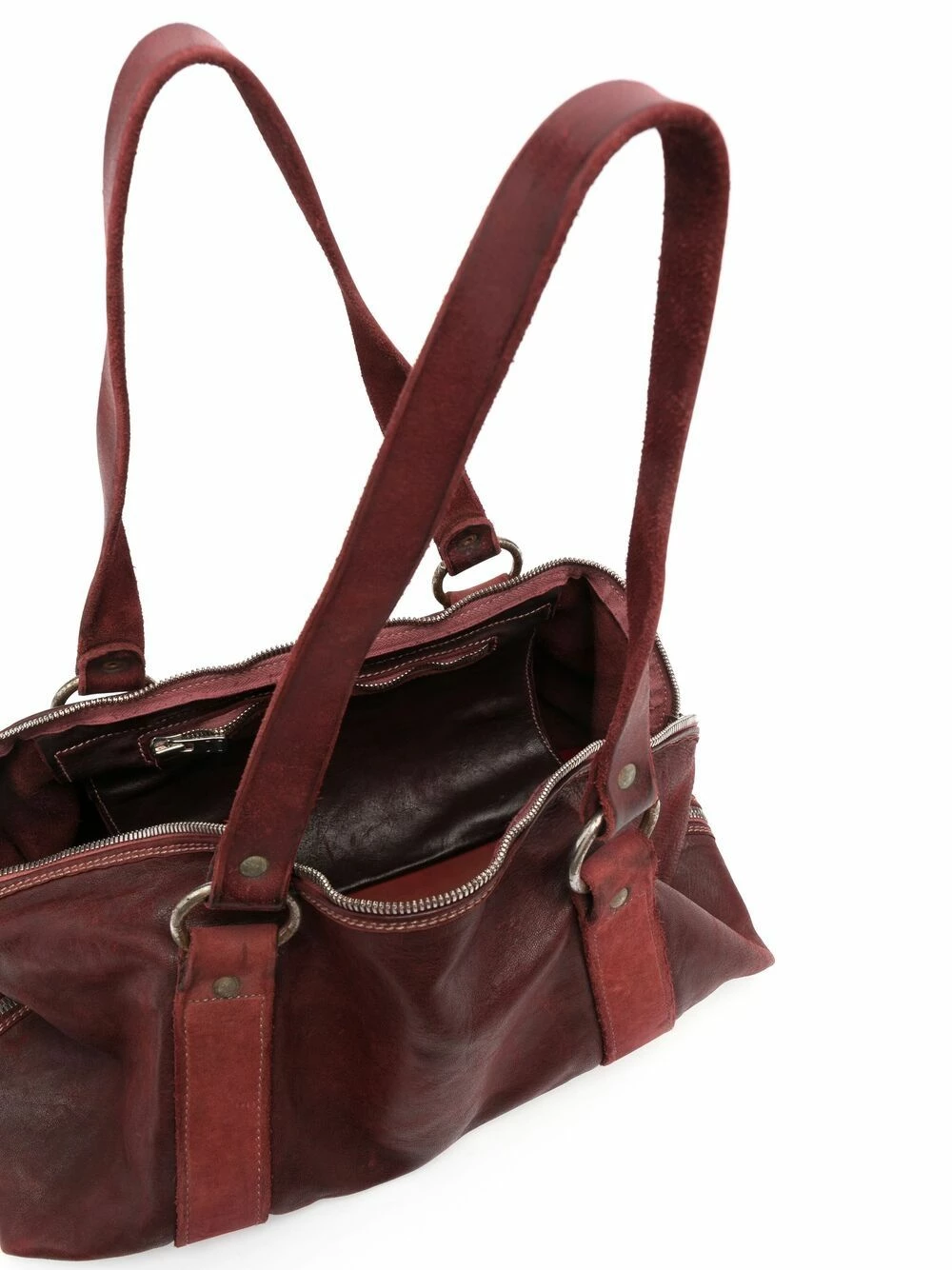 Ornements argentés, deux longues anses sur le dessus, fermeture zippée sur le dessus, compartiment principal. Couleur : rouge. Matière : cuir cordovan.