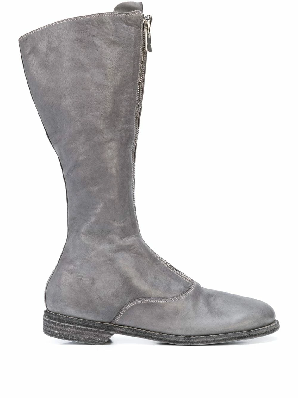 Bottes à fermeture zippée devant en cuir Guidi avec bout rond, fermeture zippée devant, empiècements à coutures visibles, longueur mi-mollet, semelle en cuir et petit talon épais.